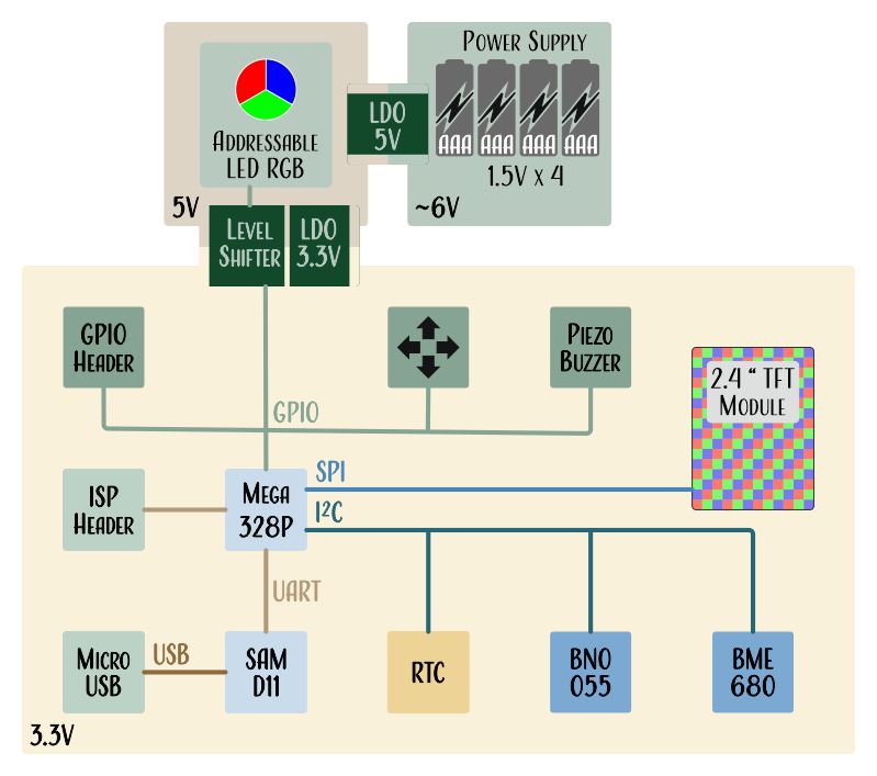The power in the circuit diagram above is delivered by batteries. The batteries feed a low-dropout (LDO) linear regulator that provides 5V to power the addressable RGB LEDs as well as a 3.3V LDO that powers the rest of the circuit. A logic-level translator will convert the Mega’s 3.3V logic outputs to 5.0V logic inputs.