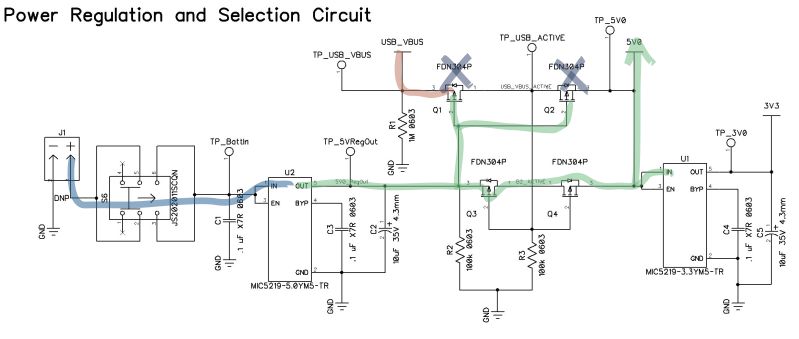 When both sources are energized, the 5.0 V LDO generates a potential difference at the gates of Q1 and Q2, shutting off the conduction path across the drain and source, stopping USB_VBUS current before it ever gets a chance to enter the rest of the circuit.