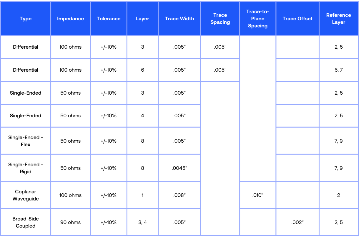 - Layer: Only the layers that contain the routed impedance traces should be listed on the table. Listing layers where the impedance trace widths aren’t present may delay a job.