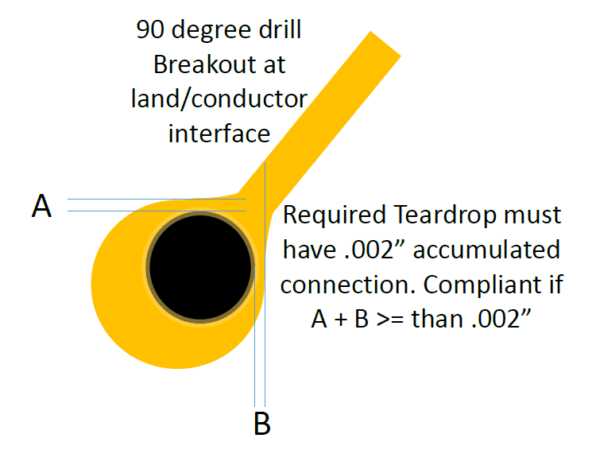 With increased densities many class 3 designs can’t achieve a minimum .000975” minimum annular but can’t accept 90 degree breakouts for high reliability. A useful comprise is the allowance of tangency as long as teardrops are added to the land/conductor interface.