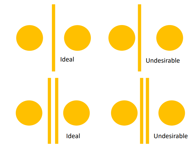 As a PCB fabricator we document our yields and design attributes that relate to any particular defect. For shorts, one of the attributes is the designed conductor space. We know that the yields drop when the space is smaller. Here is an example when I was visiting a customer with two part numbers with the identical components and design density. One part had a right side purpose and the other the left so they were identical mirrored parts. When we built the two parts one was delivered on time and at quantity and the other needed a remake and was delayed. The customer asked if we would opine why there was a difference. When I reviewed the yield information of both high layer count, multiple Ideal Undesirable Ideal Undesirable laminated, very densely designed HDI PCBs, I found that the higher yielding PCB had .089mm/.0035” space, and the other PCB was designed with a space of .076mm/.003”. The final yield difference was 5%, which was just enough to cause a remake and the delay. The point of this example is that every opportunity that exists to increase space should be done as stated in IPC-2222 section 10.1.4. Will it take longer to design? Why yes, but the original layout is only done once, with very little or no spacing modification for following revisions. The design is done once, but we fabricators have to process each layer and each image with greater or lesser yields. The impact of unnecessary finer spacing will increase the cost of your PCB. The minimum space is a direct cost adder for the product life of each PCB design. The other impact that is normally not considered (but should be) is the waste of material, processing time, and money for remakes simply because the available spacing was not maximized or the minimal spacing was not utilized only in the components that needed a finer space.