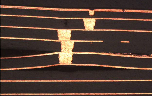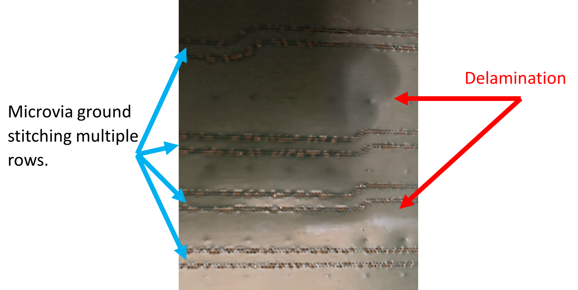 If the moisture is not removed before assembly, the chance of a delamination will exist. Other examples of delamination due to HDI multiple rows of ground stitching and plane layers with over 93% retailed copper area.