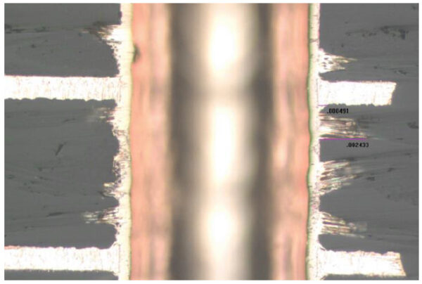 A part that passes electrical test, can fail in the field because of conductive anodic filament CAF. This is the migration of copper between vias and it is necessary to plan for the potential of .002” growth in your design. It also necessary for the planning of “dielectric removal” and wicking. This is created by drilling, desmear and etchback operations which opens pathways in the dielectric for copper to deposit, and where CAF can potential grow in the hole wall. Here is an example with etch back with allowable smear removal and wicking.