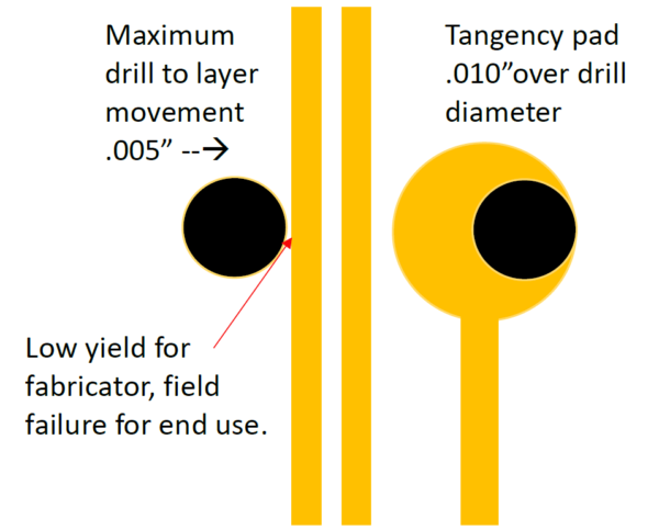 The next image takes the last image and shifts .005” which illustrates worst case of a layer movement, multiple lamination movement and drill wander.
