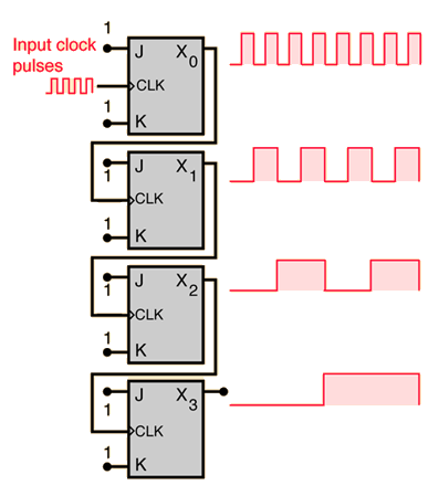 The RTC circuit detects the transitions of the oscillator, and a series of flip-flops on the die go to work successively dividing the signal 15 times, until the final stage of the circuit keeps track of seconds.